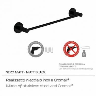 La instalación de este toallero es rápida y sencilla, ya que puede fijarse a la pared con tornillos o con cola (que se vende por separado). Esto te ofrece opciones flexibles para instalarlo de acuerdo a tus preferencias y necesidades específicas. El acabado en negro mate añade un toque de elegancia y modernidad a cualquier decoración de baño, creando un ambiente sofisticado y acogedor.
