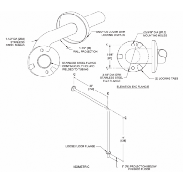 Barra de apoyo de pared a suelo con brida de encaje, diseñada para ofrecer seguridad adicional en espacios accesibles. Fabricada en acero inoxidable tipo 304 con un diámetro de 1-1/2" (38 mm) y acabado texturizado que mejora el agarre para una mayor estabilidad. Incluye una brida de montaje oculta de 3-1/8″ (79 mm) de diámetro exterior con dos orificios para tornillos y tres hoyuelos de bloqueo, proporcionando una instalación segura y estética. La cubierta de la brida es de acero inoxidable calibre 22, con un diámetro de 3-3/16″ (81 mm) y acabado satinado que aporta durabilidad y resistencia a la corrosión. Dimensiones: 30" x 33" (762 mm x 838 mm).