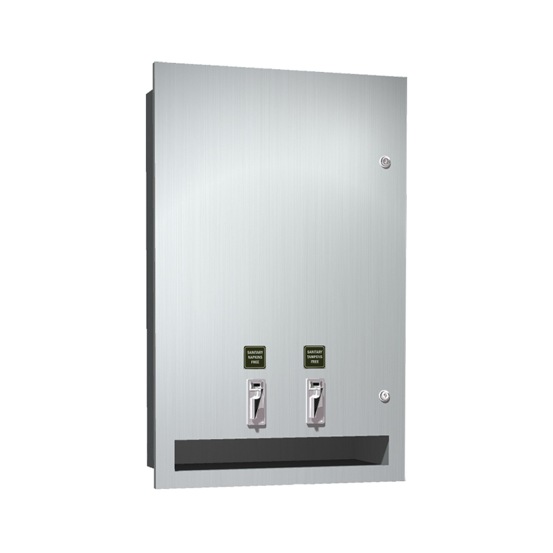 El dispensador empotrado ASI de 15 toallas sanitarias y 23 tampones ofrece una opción sin costo para los usuarios, ya que la operación es gratuita. Las puertas del dispensador se mantienen cerradas con dos cerraduras de borjas, asegurando la seguridad del contenido. La caja de monedas interna tiene una llave diferente a las cerraduras de las puertas, lo que facilita el acceso y control. Los mecanismos dispensadores están montados internamente para permitir el cambio fácil de la denominación de las monedas. Incluye pesos para cada pista de alimentación, asegurando un dispensado adecuado de los productos. Las dimensiones generales son 17-1/4″ x 27-1/4″ x 4-1/2″ (438 x 692 x 114 mm) y la abertura de la pared tiene unas medidas de 16″ x 26″ x 4″ (406 x 660 x 102 mm). Este modelo es ideal para instalaciones donde se desea ofrecer productos sanitarios sin costo para los usuarios, manteniendo la seguridad y la funcionalidad en todo momento.