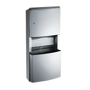 Distributeur de papier avec bac à déchets amovible de 11,2 L en acier inoxydable satiné d'une capacité de 350 lingettes pliées en C ou 475 lingettes à plis multiples.