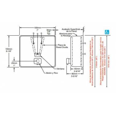 Distributeur de savon pour montage en surface modèle Contura Bobrick . Il est en acier inoxydable satiné. Il possède une valve résistante à la corrosion des savons d'usage commercial général pour les mains sous forme liquide. Il a une capacité de 1'2L. Il a une garantie de trois ans. Pour pouvoir remplir le distributeur de savon, il est nécessaire d'utiliser la clé fournie avec le produit. Ses dimensions sont de 180 mm de largeur, 155 mm de hauteur et projeté de 85 mm à la surface du mur.