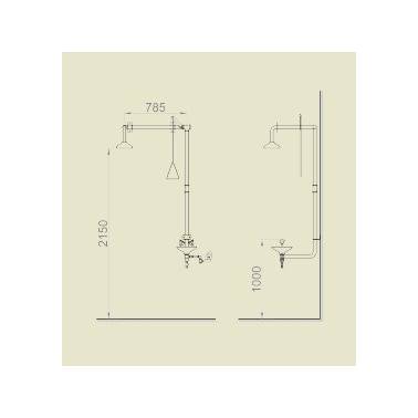 Ensemble douche et douche oculaire au-dessus de la porte avec levier manuel latéral en acier galvanisé peint époxy vert. Pommeau de douche et pelle à poussière en acier inoxydable. Connexions en laiton.