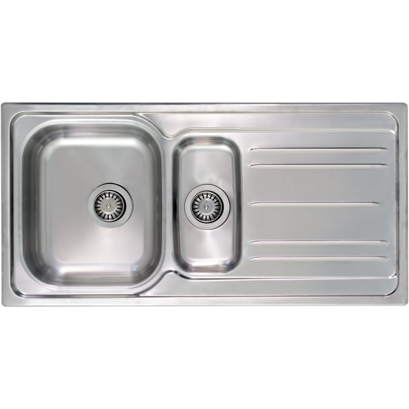 El fregadero encastrable Helios de 100x50 cm, para mueble de 60 cm, de la marca Practic, es una solución versátil y elegante para la cocina. Su diseño reversible permite instalarlo con el escurridor a la derecha o a la izquierda según las necesidades, y su acabado en acero inoxidable AISI 304 de 0,8 mm de espesor garantiza una alta resistencia a la corrosión y un mantenimiento sencillo. Dispone de dos cubetas: una principal de gran capacidad y 200 mm de profundidad fabricada en una sola pieza mediante embutición, sin soldaduras, y una cubeta auxiliar de 130 mm unida con soldadura eléctrica continua para mayor solidez. La superficie incluye bandeja de escurrido y válvulas de desagüe T73BP y T72BP de gran diámetro, que favorecen un drenaje rápido y eficiente. Su diseño sin orificio para grifería brinda libertad para combinar con distintos tipos de grifos y configuraciones. Ideal para cocinas modernas que buscan funcionalidad, estética y durabilidad.