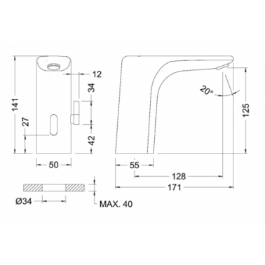 Grifo de lavabo mezclador con sensor para instalar sobre encimera, fabricado según UNE-EN 15091 con certificado CE , en latón CW617N cromado según EN 248. Dotado de un sistema de detección por infrarrojos, con programación de seguridad de uso, con cierre por exceso de tiempo. Opción de alimentación mediante fuente de alimentación AC (Ref. 9908 0407) Con caja porta pilas externa para 4 pilas AA (no suministradas). Provisto de un aireador antivandálico anti calcáreo economizador con limitación dinámica. Incluye filtro, conexiones flexibles según EN 13618 y elementos de fijación. El grifo de lavabo se activará después de colocar las manos debajo del aireador un mínimo de 1 segundo a una distancia del sensor de hasta 130 mm. Al separar las manos del área de detección del sensor el agua dejará de salir. Fabricado según UNE-EN 15091. Cuerpo realizado en latón según UNE-EN 1982. Cromado según EN 248. Aireador antivandálico anti calcáreo economizador dinámico. Suministrado con conexión de 60 cm M10x1 H 1/2”, para conectar la caja de control al grifo de lavabo. Con conjunto de sujeción acero inoxidable 304. Temperatura máxima: 70 °C. Temp. máxima recomendada: 50 °C. Presión máxima: 7 bar. Presión mínima: 0,5 bar. Presión recomendada: 1-3 bar.