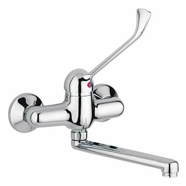 Mitigeur monocommande mural avec levier gérontologique fabriqué en laiton chromé Nofer. La distance entre les prises de vue est de 150 ± 20 mm. Manœuvré par une poignée clinique, facile à utiliser et hygiénique, la grande longueur du levier permet de manœuvrer facilement avec le coude lorsque les mains sont sales ou en cours d'utilisation.