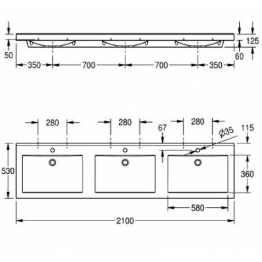 Vasque murale triple Quadro de forme rectangulaire et trou pour robinet, marque Franke MIRANIT. Le matériau est minéral aggloméré en résine synthétique en blanc alpin. Les trois bassins ont une forme rectangulaire sans joints et sans trop-plein. Paroi arrière formée avec supports et trous de fixation intégrés, égouttoir arrière. Comprend le matériel de fixation (vis et chevilles à double filetage). Ses dimensions sont de 2100x125x530 mm (LxHxP) et les dimensions du godet sont de 580x360x40 / 90 mm (LxlxH), il y a une distance de 700 mm entre le godet et le godet.