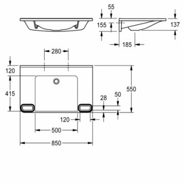 El lavabo a pared MEDICARE de 850 mm sin orificio para grifería en Blanco Alpino de Franke KWC está diseñado para entornos donde la accesibilidad y la higiene son prioritarias. Fabricado en MIRANIT, un material mineral aglomerado con resina, ofrece una superficie lisa y no porosa extremadamente resistente (hasta 80 °C) y fácil de limpiar. Su elegante acabado en Blanco Alpino se complementa con asideros integrados y un borde con rayas gris basalto, que aportan seguridad y confort al usuario. Este lavabo está especialmente adaptado para el uso de personas en sillas de ruedas gracias a su diseño abierto inferior y cubeta moldeada sin costuras, lo que facilita el acceso frontal. Incorpora estantes laterales funcionales, sin rebosadero ni orificio para grifería, favoreciendo la limpieza y reduciendo los puntos de acumulación de bacterias. Incluye protector trasero contra salpicaduras y herrajes de montaje para una instalación segura y sencilla. Dimensiones: 850 x 150 x 550 mm (An x Al x Pr). Dimensiones cubeta: 500 x 117 x 415 mm. Una opción moderna, segura y funcional para espacios sanitarios exigentes.