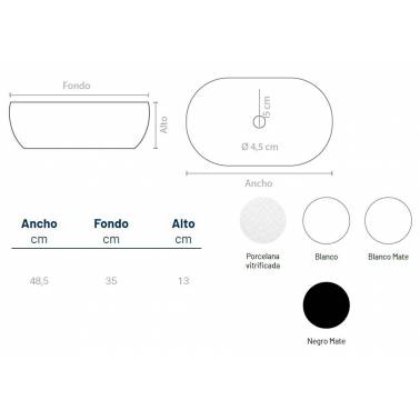Lavabo ovalado para colocar sobre encimera de color blanco marca Komercia. Tiene 48’5cm de ancho. Disponible en color blanco, blanco mate o negro mate. Fabricado en porcelana vitrificada de color blanco. Se suministra con orificio para colocar el grifo.