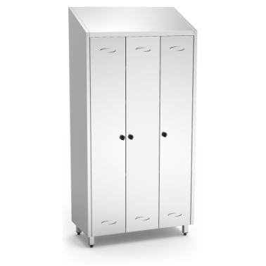 Armoire avec étagères 3 portes de 980x480x2010 mm. Il est entièrement réalisé en acier inoxydable, finition satinée. Il a un toit en pente et quatre pieds de 115 mm de hauteur pour un nettoyage facile en dessous. Ces pieds sont positionnés de manière à combler la courbe sanitaire dans le mur. Les pieds sont réglables. Il a une ventilation par des évents incrustés. Bouton avec possibilité de fixer un cadenas