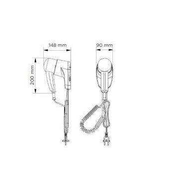 Sèche-cheveux de type pistolet à air chaud avec support mural. Le support et le pistolet sont en plastique ABS bicolore (argent et noir). Base attachée