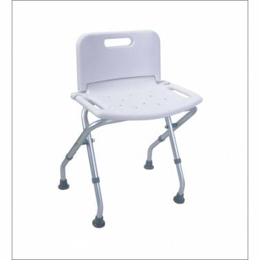 Banc avec support de pomme de douche en aluminium finition blanche. Poignées sur le siège. Capuchons en caoutchouc antidérapants aux extrémités des jambes. Trous de drainage dans le siège pour éviter la stagnation de l'eau. Convient pour une utilisation sous la douche. Siège réglable.