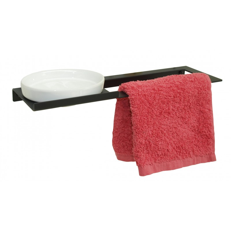 Toallero corto con jabonera Nina en acero inoxidable esmerilado. Combina almacenamiento y funcionalidad en un solo accesorio. MEDIDAS: 340x100x35 mm.