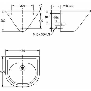 Wall-mounted sink made of stainless steel, satin finish, HEAVY-DUTY model, Franke brand. Single washbasin with a material thickness of 1.2 mm, 3 threaded rods for mounting to the wall from a utility room, seamless welded basin, 40 mm tap shelf, no spout or overflow, 1 flat hole for drain 1/4 ". Includes concealed mounting siphon DN 32. Its dimensions are 450x280x400 mm (WxHxD)