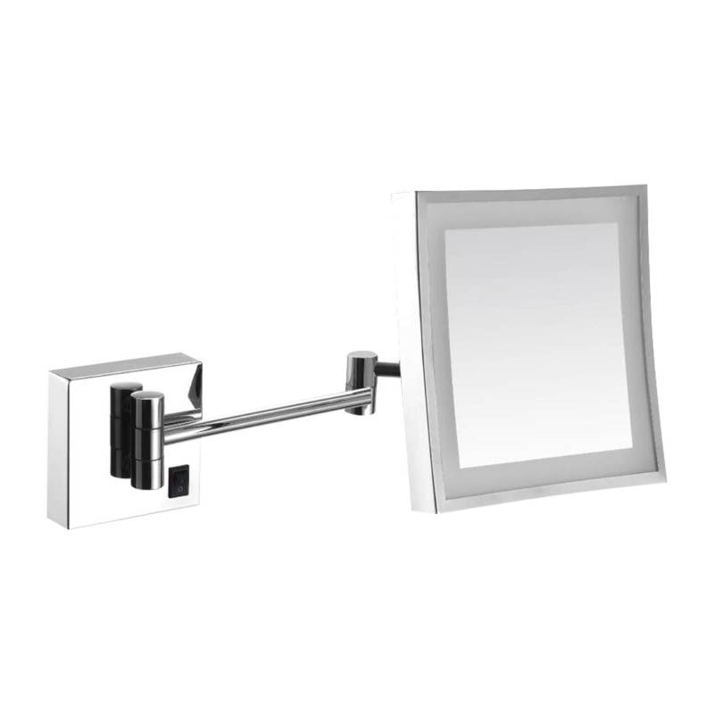 Magnifying mirror with integrated Led light and Nofer extendable bar. It is installed to the wall leaving the fixing screws hidden, the screws are included. It is made of brass and polished stainless steel, a durable material that resists corrosion. It connects to the network to provide light, includes a plug with an 80cm cable. Complies with CE regulations. Magnification x3. Its folded dimensions are 252 height x 230 width x 116 depth (mm), unfolded 252 height x 230 width x 400 depth (mm) and the dimensions of the mirror are 202 height x 202 width (mm).
