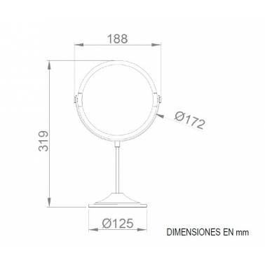 Counter top magnifying mirror with two sides, one for normal vision and the other for magnification (x5) Nofer. It is made of chrome-plated brass with a gloss finish, a durable and corrosion-resistant material. Its dimensions are 319x188x125mm (Height x Width x Depth) and the dimensions of the mirror are Ø172mm in diameter