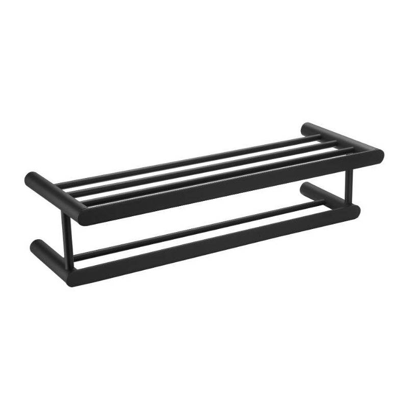 Optimiza tu espacio con el estante para toallas con barra de acero inoxidable AISI 304 negro de la serie Aura, con dimensiones de 600x215x150 mm.