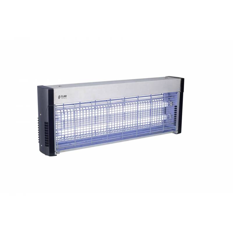 Con dos tubos T8 de 40 W, este eliminador de insectos está fabricado en acero inoxidable 304 y ABS, con una rejilla de tensión de 2,5 kV. Es una solución ideal para grandes áreas interiores donde se requiere una protección continua contra plagas, con un bajo consumo energético y sin el uso de productos químicos.