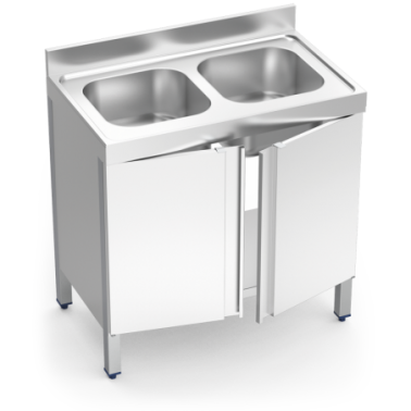 Double bowl sink with hinged doors in stainless steel of 1400x700x850 mm