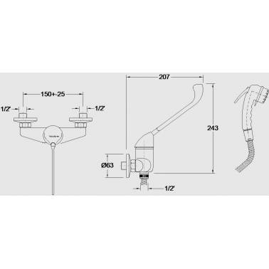 PMR Valadares single-lever shower mixer with pressure gun. Shower faucet with gerontological handle made of chrome-plated brass. Maximum temperature of 65ºC. 5 year warranty.