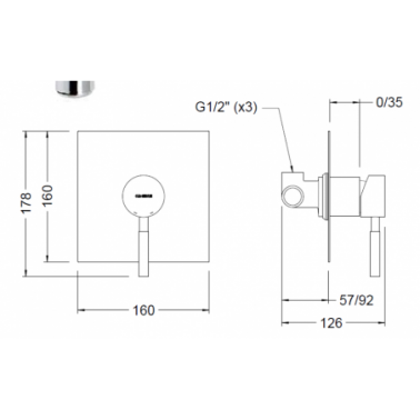 Monomando de ducha empotrado acabado cromado de alta calidad, para instalar en pared. Grifo con cartucho cerámico D40 convencional y placa deslizante en latón.