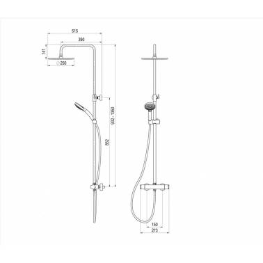 Characteristics: the materials that make up the parts of the taps can withstand a maximum temperature of 70ºC. Faucet made of brass with chrome finish. Minimum pressure for use: 0.5 bar. Hand wheel drive. Cold body. Thermostat 1/2 turn. Thermostat diameter 25 mm. Distributor ceramic mount. 3/4 female inlet. Supplied with 1/2 to 3/4 eccentrics, flexo, wall support and 100 mm diameter handle 4 functions. Chrome finish stainless steel shower head with a diameter of 250 mm. Flow of 11.9 l / minute at 3 bar and maximum opening. Height-adjustable column (telescopic). Inverter integrated in command.