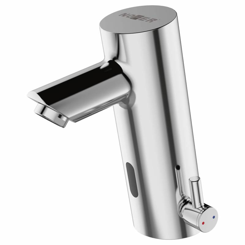 Grifo electrónico mezclador de lavabo para colocar sobre la encimera marca Nofer. El cuerpo del grifo está fabricado en latón cromado, los componentes están fabricados en plásticos cromados bajo norma EN248. Construcción robusta y antivandálica. Dos aguas. Caudal de 3 bar, 6l/min. La temperatura de trabajo es de 1 a 80ºC, la temperatura máxima recomendada es 60ºC. Presión de trabajo entre 0’5 a 6 bar. Para que el grifo funcione se deben colocar las manos bajo el rociador, este se activará automáticamente cuando el sensor infrarrojos detecte movimiento, mientras las manos permanezcan dentro del campo del sensor caerá el agua y se apagará unos segundos después de retirarlas. Tiene un rango de detección entre 12 a 18cm. Funciona mediante conexión a red eléctrica ½”G utilizando cuatro pilas doble A que proporcionarán 6V como apoyo de seguridad por si se produce un corte de corriente. AC 220 – 50/60Hz / DC6V (Cuatro pilas AA). Consumo en stand by: <0,5 mW. Caño fijo. Incluye un filtro plástico antipartículas y conexiones de tubos flexibles TUCAI de 400mm incluidos 3/8”G. Apto para zonas comunes con alta frecuencia de uso. Cumple con las Directivas Europeas de Seguridad Eléctrica 2014/35/UE, Compatibilidad Electromagnética EMC 2014/30/EU y Productos de la Construcción 305/2011UE según las normas EN817:2008 y EN 15091:2013. Certificado CE. Sus dimensiones son 142mm de alto, 62mm de ancho y 183mm de profundidad. Fabricado por Nofer.