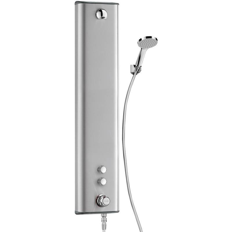 Securitherm stainless steel thermostatic shower panel, top feed, Delabie brand handheld shower
