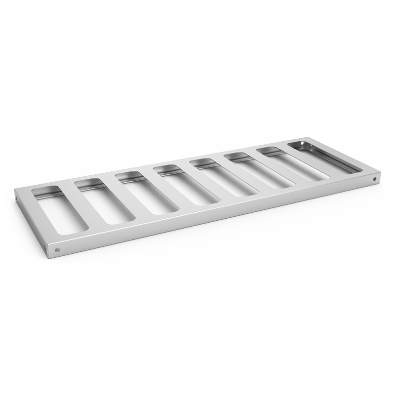 El estante para almacenaje de botellas de la marca Fricosmos mide 1000x300 mm y está fabricado completamente en acero inoxidable AISI 304 de 1.5 mm de espesor. Este estante está diseñado para alojar cómodamente hasta 11 botellas de vino, dependiendo de las dimensiones de cada botella. Las perforaciones del estante facilitan el almacenaje y permiten una adecuada ventilación, asegurando que todas las botellas estén expuestas de manera uniforme a la temperatura y humedad del entorno. Compatible con todas las estanterías Fricosmos, es ideal para optimizar el espacio de almacenamiento en entornos comerciales y residenciales.