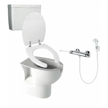 Ergonomic toilet kit with floor outlet, cistern, seat and thermostatic mixer Nofer