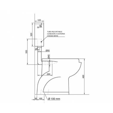 Ergonomic toilet kit with floor outlet, manually operated cistern made of white ABS, seat and cover with front opening and thermostatic mixer with gerontological handle for Nofer personal hygiene. The toilet has a front opening and is made of vitrified porcelain in white. Designed to be installed in bathrooms adapted for people with reduced mobility. It has two fixing points on the ground. The drain is Ø100mm. Constructed of a durable, water resistant and easy to clean material.
