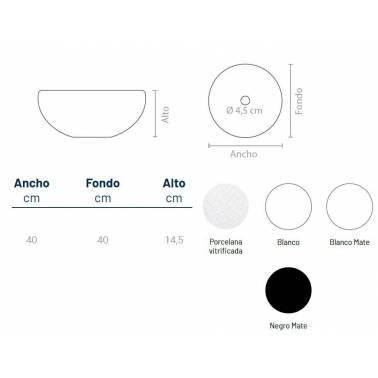 Round washbasin to be installed on a white Komercia countertop. It has a diameter of 40cm. This sink is available in white, matte white or matte black. Made of white vitrified porcelain. Its dimensions are 40cm wide, 40cm deep and 14.5cm high. The valve has a diameter of Ø4.5cm.