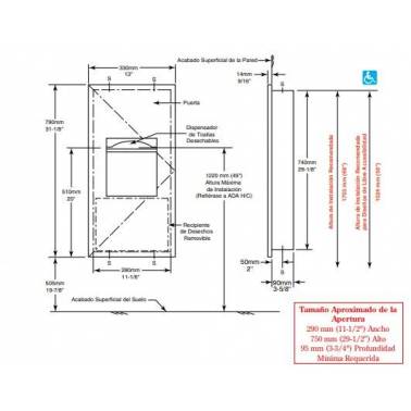 TrimLine Bobrick Series Recessed Paper Towel Dispenser and Waste Container. It is made of satin finished stainless steel. The door features a 90 ° bend with seamless, bevelled edges. Distribute 300 C-fold or 400 multi-fold towels. The removable leak-proof container with a capacity of 6L. It has a lock with a key to provide greater security. Its dimensions are 330mm wide, 790mm high and 14mm projection on the surface of the wall.
