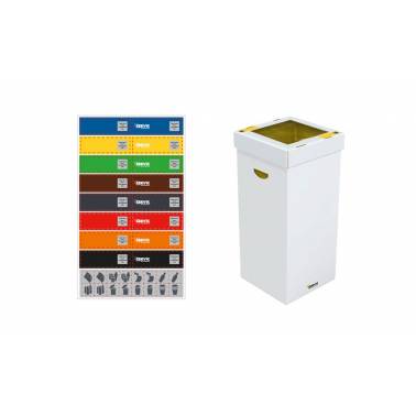 100L reusable cardboard bin special for Cervic events and fairs. Includes a kit of stickers to customize the icon and color of the residue. Assembly and disassembly is very easy. The plastic bag is placed inside the bin attached to the body and hidden by the lid. Made of highly resistant Kraft anti-humidity cardboard. Its dimensions are 380x365x820mm
