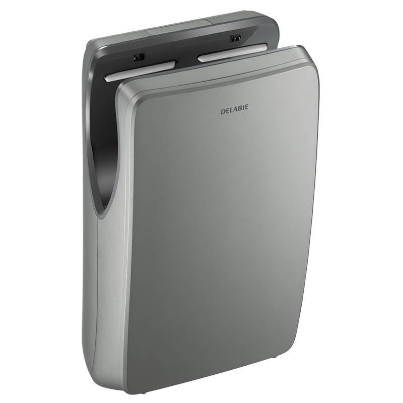 Speedjet 2 pulsed air hand dryer in metallic anthracite with tank, Delabie brand. It offers quick and comfortable drying of hands with an elegant and contemporary style.