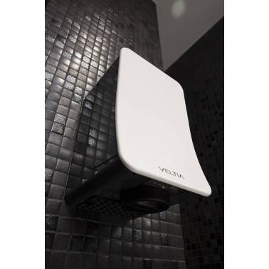 Secador de manos automático modelo Vfusion marca Veltia. Incluye dos frontales, una en color blanco y otro del color que elija o dos frontales de colores, dos salidas de aire, un filtro Hepa capaz de retener las partículas contaminantes con alta eficacia y Zerosmell para neutralizar los olores. Tiene un sistema automático de detección de manos para no tener que tocar nada. Dispone de dos modos de utilización, Eco y Turbo. Dos tipos de salida del aire Multi-jet p Blade.