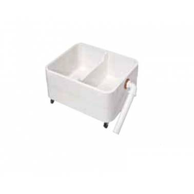 Sludge collection bucket made of mineral material agglomerated in synthetic resin, model MIRANIT, Franke brand. Collection tray with smooth surface and free of pores (resistant to temperatures up to 80ºC). Large inner radii. Alpine white color. Version with 2-chamber system with removable separator made of plastic material, overflow for a controlled overflow in a floor drain provided by the customer. On lockable wheels. Overflow DN 50 with PVC pipe elbow. PVC pipe and pipe elbows with mounting hardware included. Its dimensions are 660x370x550 mm (AxAxP)