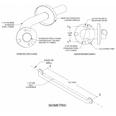 Barra de apoyo recta de 42" (1067 mm) con brida de encaje, construida en acero inoxidable tipo 304 con acabado en pintura en polvo blanca, ideal para proporcionar un soporte seguro en baños accesibles y áreas de asistencia. Su diseño incorpora una brida de montaje oculta de 3-1/8" (79 mm) de diámetro exterior, con dos orificios para tornillos y tres hoyuelos de bloqueo, garantizando una instalación firme. La brida tiene un grosor de 1/8" (3 mm) para una resistencia excepcional. Además, la cubierta de acero inoxidable tipo 304 con acabado satinado, de calibre 22 y diámetro de 3-3/16" (81 mm), cubre los tornillos para una apariencia moderna y estética. Recomendada para instalaciones en espacios comerciales y residenciales.