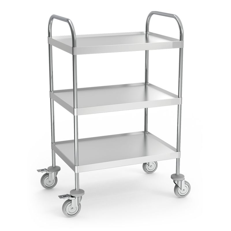 Carro de servicio multifuncional con 3 entrepaños. Este carro auxiliar es una herramienta versátil y útil para diversos sectores como la alimentación, el ámbito clínico y la hostelería. Fabricado en acero inoxidable AISI 304, garantiza durabilidad y resistencia a la corrosión. Con unas dimensiones de 835x615x1275 mm, el carro dispone de tres niveles regulables en altura con pliegues reforzados y pestañas aplastadas para evitar accidentes durante su uso y limpieza. Cada nivel soporta hasta 140 kg, y la capacidad de carga total del carro es de 280 kg. Incorpora cuatro ruedas de ø125 mm con superficie de rodadura de baja sonoridad, dos de ellas con freno, para asegurar la estabilidad cuando sea necesario. Este carro puede ser equipado con niveles adicionales según las necesidades del usuario. Su diseño robusto y adaptable lo convierte en una herramienta esencial y fiable en cualquier entorno de trabajo.