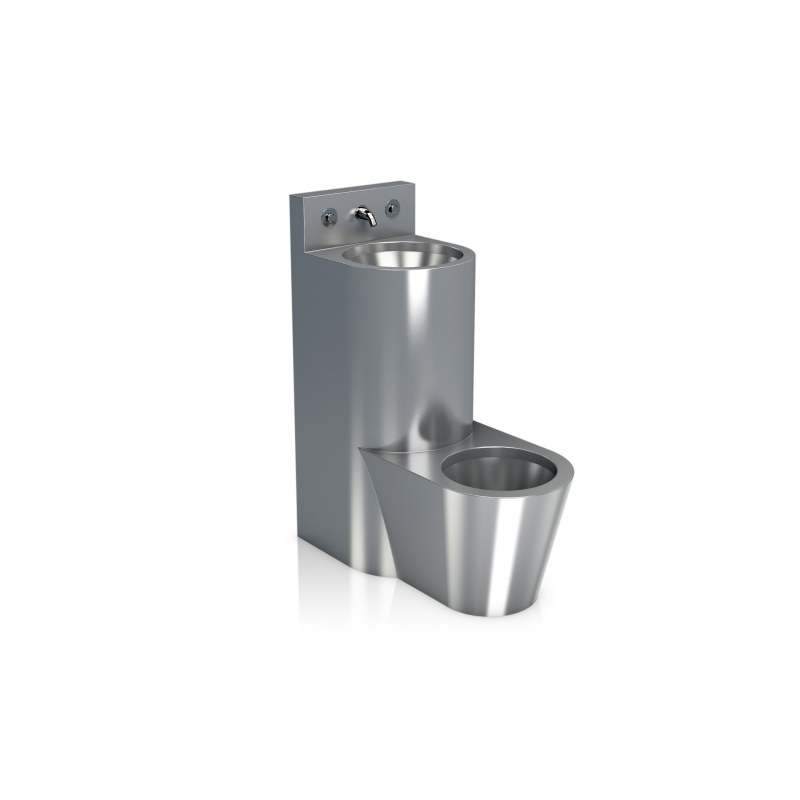 Lavabo e wc antivandalo con wc Genwec a destra. Realizzato in acciaio inossidabile 304 con finitura satinata da 1,5 mm. Include rubinetti, connessioni e ancoraggi.