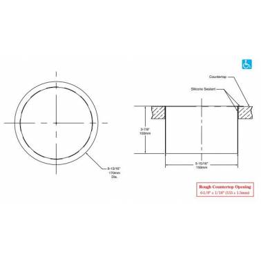 Sfioratore circolare in acciaio inox satinato da incorporare nel piano di lavoro Bobrick . Le sue dimensioni sono di 176 mm di diametro, 130 mm di altezza e 11 mm di sporgenza.