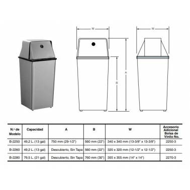 Pattumiera senza coperchio in acciaio inossidabile satinato con una capacità Bobrick 49 litri. Ha piedini in gomma e una fascia in vinile per proteggere le pareti in caso di impatto. I piedini in gomma prevengono i danni causati dal contatto diretto con il suolo. Le sue dimensioni sono 320 mm di larghezza, 560 mm di altezza e 320 mm di proiezione.
