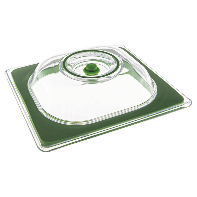 Tapa de policarbonato resistente para cubetas GN 1/6, compatible con sistemas de vacío. Proporciona un sellado seguro que mantiene los alimentos frescos y protegidos, y su material duradero garantiza larga vida útil y facilidad de limpieza.