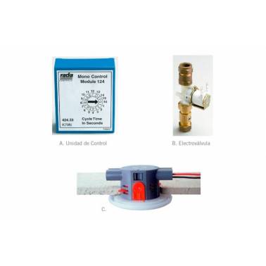 Sistema elettronico integrato completo indipendente per orinatoio Rada monocontrol 126 PRESTO . È un set di sensore, unità di controllo individuale ed elettrovalvola di facile installazione e programmazione. È un set di sensore, unità di controllo individuale ed elettrovalvola di facile installazione e programmazione. Questo sistema aiuta l'igiene in quanto non necessita di contatto per l'attivazione. Gli elementi sono collegati tra loro tramite cavi a bassa tensione che garantiscono grande sicurezza all'installazione, si installa a soffitto. Il sistema è antivandalo in quanto i suoi componenti sono facilmente occultanti, è flessibile ed economico poiché permette un grande risparmio di acqua. La base e lo schermo del rilevatore sono realizzati in ABS. Elettrovalvola 12V, 1/2 ”, protezione IP 55, alimentazione 12V / 50HZ. La distanza di rilevamento è compresa tra 0,5 e 2,5 m. Include un cavo a 2 fili da 3 m.