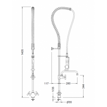Columna de cocina profesional con grifo mezclador monobloc y grifo con caño giratorio para instalar sobre encimera. El grifo con caño está dotado de una montura cerámica de 1/4 vuelta, mientras que el grifo mezclador cuenta con monturas de 1/4 vuelta, conexiones flexibles y válvulas antirretorno. Fabricada con un muelle cromado de acero inoxidable AISI 304, incluye un flexo con tubo interior PEX, mallado en acero inoxidable y funda plástica, con doble grapaje y tuercas giratorias de 1/2”. La ducha tiene cierre automático y anilla de retención para uso continuado, con un mango de tecnopolímero antiescaldamiento. Los soportes en latón cromado son regulables en altura y cumplen con la norma EN 248. El aireador plástico antical es hembra M22x1 y viene con faldón de latón cromado. La columna incluye latiguillos de 35 cm (M10x1; G ⅜”), y el conjunto de sujeción mediante herradura metálica y juego de retenciones. Soporta una temperatura máxima de 80 °C (máxima recomendada de 65 °C) y presiones entre 0,5 y 10 bar, con una presión recomendada de 1 a 3 bar.