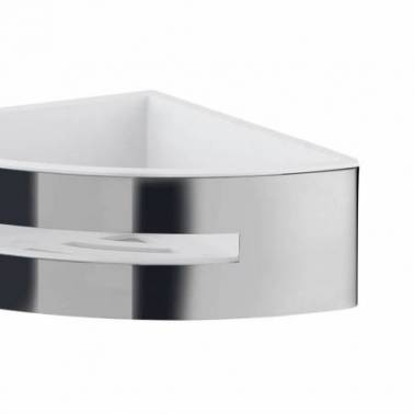 Organizer angolare Poseidon in cromo con dettagli bianchi. Installazione semplice con viti e secchio rimovibile.