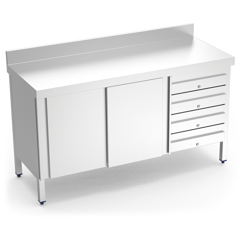 Fabricada totalmente (interior y exterior) en acero inoxidable AISI 304 por Fricosmos. La encimera tiene un espesor de 1,5 mm, reforzada e insonorizada. Dos o tres puertas correderas suspendidas, sin carriles inferiores donde se pueda depositar la suciedad. Laterales forrados, doble entrepaño, trasera y lateral interior en la zona del armario. Cuatro cajones con cerradura, con dimensiones interiores de 460x440x140 mm. Las patas traseras están retranqueadas para adaptarse a las curvas sanitarias del suelo con pared, y los pies son regulables conforme a la normativa alimentaria.