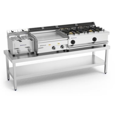Tavolo da cucina centrale con ripiano basso 1200x500 mm. Il piano di lavoro è rinforzato e insonorizzato con uno spessore di 1,5 mm. Le gambe sono offset 40x40 mm per curva sanitaria, finitura lucida. Si adattano a qualsiasi livello del terreno poiché le loro gambe sono regolabili