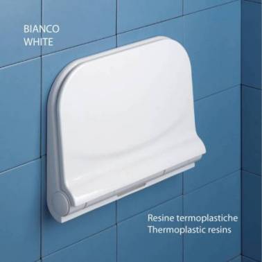 Sedile per doccia pieghevole Dino di colore bianco, realizzato con resine termoplastiche. Testato per un peso massimo di 120 kg.