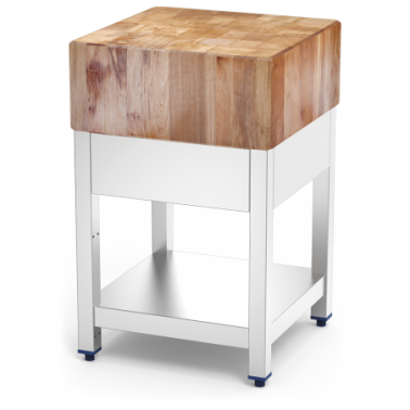 Ceppo di legno con gonna 500x500x900 in betulla spessore 250 mm. Realizzato con telaio in tubo di acciaio inox, ripiani in lamiera di acciaio inox insonorizzati e nessun legno incollato all'interno. Piedini regolabili per una maggiore stabilità e comfort su qualsiasi tipo di terreno