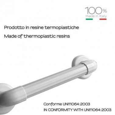 Puxadores e barras de apoio para banheiros adaptados para deficientes e pessoas com mobilidade reduzida, fabricados em alumínio revestido com nylon para maior resistência à umidade. Fabricado em alumínio, um material leve e resistente, e forrado com nylon, que é uma poliamida artificial que lhe confere resistência ao uso e à umidade.